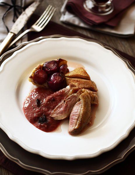 Šljive skuhajte u vodi te kad omekšaju, od njih napravite pire. U posudu ulijte vino, prošek i začine pa kuhajte na umjerenoj vatri. Kad zakuha, pustite da se krčka još 10-ak minuta. Dodajte sok od naranče, senf, pekmez i pire od šljiva. Kuhajte na laganoj vatri još nekoliko minuta. Izvadite štapić cimeta i zvjezdasti anis pa umakom prelijte pačja prsa.