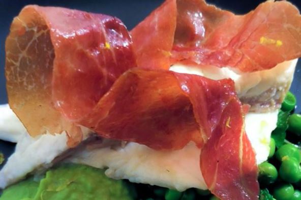 POŠIRANA RIBA SA PEČENIM PRŠUTOM, KREMOM I SALATOM OD GRAŠKA I BILJA