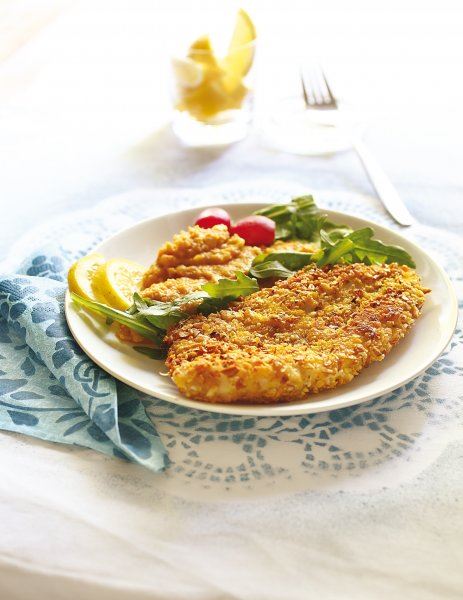 Filete operite i svaki posolite prstohvatom soli. Pomiješajte brašno i hladnu vodu tako da dobijete glatku smjesu. Kukuruzne pahuljice usitnite u mužaru, a bademe sitno nasjeckajte. Svaki filet uronite u smjesu brašna i vode, a zatim stavite u suhu smjesu kukuruznih pahuljica i badema. Zagrijte ulje u tavi i pripremljene filete pržite na srednje jakom plamenu s obje strane dok ne poprime smeđasti ton. Pohane filete ocijedite na papirnatom ubrusu. Poslužite uz pire od crvene leće i salatu od rikole s rotkvicama.