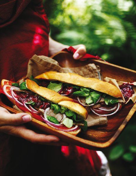 Odrezak kratko pecite na gril tavi s obje strane. Kad se ispeče, posolite ga i ostavite da se ohladi. U međuvremenu napravite umak: dobro izmiješate senf i pekmez od brusnica. Hladni odrezak narežite na tanke kriške. Peciva uzdužno prerežite pa punite kriškama odreska, ploškama rajčice, kolutima luka i matovilcem te prelijte umakom.
