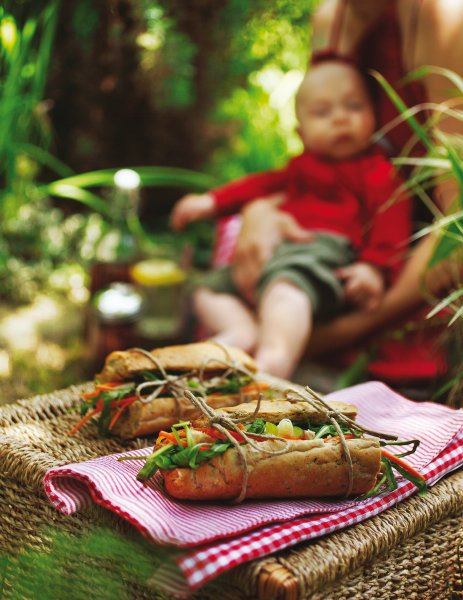 Piletini uklonite kožu i kosti. Narezano meso stavite u zdjelu. Zatim napravite umak tako da vilicom dobro izmiješate sve sastojke. Umakom prelijte piletinu pa posolite i popaprite prema želji. Baguette razdijelite na tri dijela (otprilike) i prerežite na pola. Svaki dio baguettea napunite piletinom s umakom, dodajte narezani mladi luk, mrkvu, rikolu i indijske oraščiće.