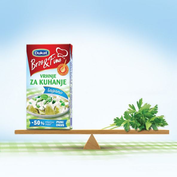 Omiljeni saveznik vaših brzih i jednostavnih jela, Dukatovo vrhnje za kuhanje Brzo&Fino sada je dostupno u novom, laganijem izdanju s čak 50% manje mliječne masti. Zahvaljujući Dukatovu iskustvu i znanju, novo Brzo&Fino vrhnje za kuhanje s oznakom "lagano" zadržalo je prepoznatljiv bogat okus te idealnu gustoću unatoč smanjenju mliječne masti.