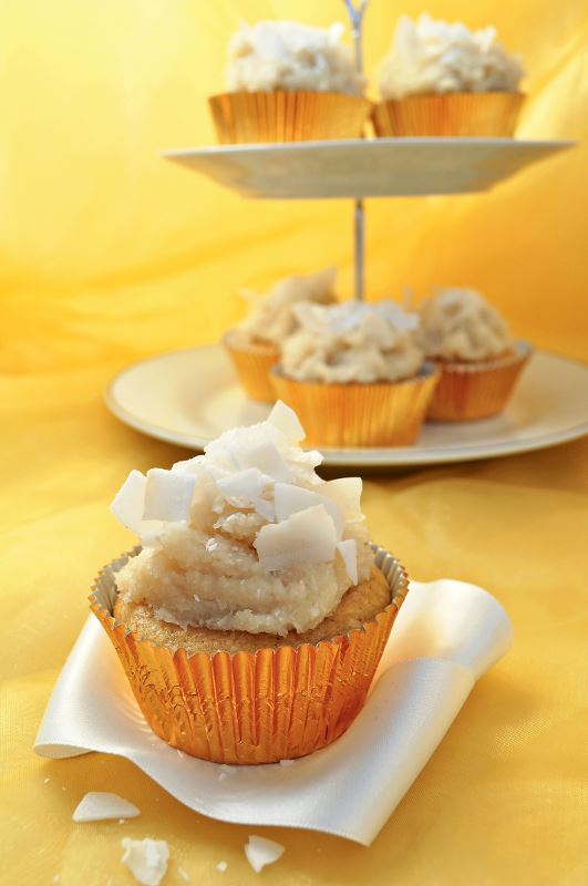 U međuvremenu skuhajte kremu. U zdjelici otopite aru/kuzu u malo hladne vode. Mlijeko i slad zagrijte pa dodajte sol i kokos. Pustite da smjesa provrije pa polako dodajte otopljeni zgušnjivač do željene gustoće, žustro miješajući na umjerenoj vatri. Ohladite pa na svaki cupcake nanesite žlicu kreme. Ukrasite listićima kokosa ili kokosovim brašnom. Za dodatnu slatkoću, prije posluživanja svaki cupcake možete pošpricati s malo slada.