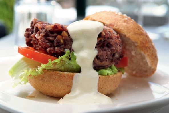 U veću staklenu posudu vilicom izgnječite grah i dodajte mu luk, orahe, mrkvu, bjelanjak, sol, kumin, kajenski papar i krušne mrvice. Rukama oblikujte četiri hamburgera. Lim za pečenje tanko premažite maslacem i složite na njega hamburgere. Pecite ih 20-ak minuta u pećnici zagrijanoj na 190 °C. Razrežite pecivo te ga lagano namažite „majonezom“ koju ste napravili dobro izmiksavši gusti jogurt i senf. Dodajte zelenu salatu, hamburger, luk ili rajčicu. Poslužite hamburgere uz pečeni mladi krumpir.