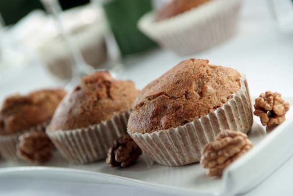 U mikseru dobro izmiješajte zobeno i integralno pšenično brašno, jaje, sodu bikarbonu i med. Dolijevajte sok od jabuke dok smjesa ne postane mekana i glatka. Dodajte nasjeckane banane, orahe i cimet pa izmiješajte. Napunite nauljeni kalup za muffine i pecite kolačiće u pećnici zagrijanoj na 180 °C oko 25 minuta ili dok se tijesto ne digne i poprimi zlatnožutu boju