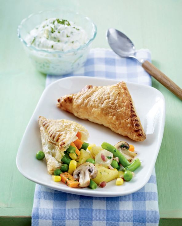 Na ulju proprijajte nasjeckani luk i češnjak sa svježim ili nekom gotovom mješavinom zamrznutoga povrća. Posolite, popaprite i začinite mediteranskim začinima. Odmrznite 4 manja pravokutnika lisnatog tijesta. Rubove premažite razmućenim žumancem, nadjenite povrćem i dijagonalno preklopite. Pecite u pećnici zagrijanoj na 180 stupnjeva 12 minuta.