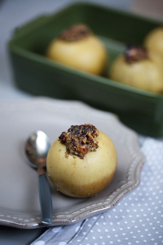 Nabavite domaće neprskane jabuke ili one iz organskog uzgoja. Operite ih i izvadite unutrašnjost priborom za vađenje ili oprezno nožićem. Prokuhajte ih tri minute u vodi u koju ste dodali prstohvat soli. Izvadite jabuke i ostavite po strani da se ohlade. U vruću vodu u kojoj su se kuhale jabuke stavite oprane grožđice te i njih prokuhajte dvije minute pa ocijedite.