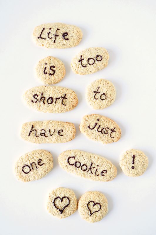 3. Dok se peku, na pari otopite čokoladu pa dodajte ulje. Ostavite da se lagano ohladi kako ne bi bila suviše tekuća. Kada su keksi pečeni, pustite da se skroz ohlade pa žličicom umočenom u čokoladu pošpricajte svaki keksić ili pomoću šprice na keksu napišite poruku. Pričekajte da se čokolada stvrdne, spremite u staklenku i čuvajte na hladnom.