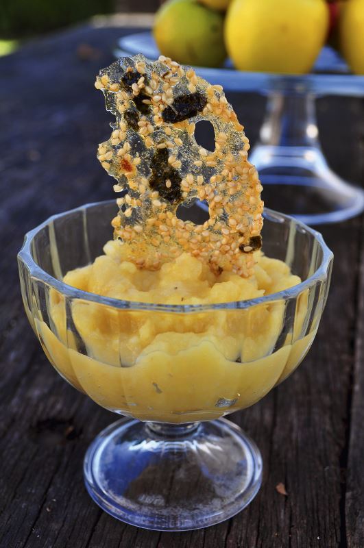 Zagrijte pećnicu na 180 ⁰C. Nori algu istrgajte na male komadiće. U zdjeli je dobro pomiješajte s ostalim sastojcima za krokant. Na papir za pečenje špatulom razmažite smjesu u što tanjem sloju, lijepit će se, ali budite uporni. Pecite 7 do 8 minuta. Smjesa će se pjeniti, što je u redu, pecite je dok slad lagano ne porumeni.