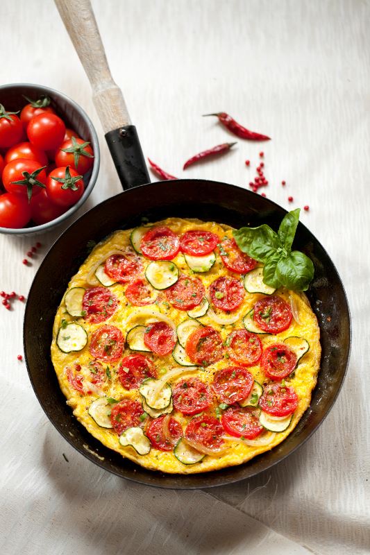 Cherry rajčice narežite na ploške, tikvicu na tanke ploške, a luk na tanke polumjesece. Jajima dodajte sol i promiješajte vilicom. Zagrijte ulje na većoj tavi, dodajte luk i tikvice. Lagano promiješajte i dodajte jaja. Na njih poslažite ploške cherry rajčice i pecite dvije-tri minute na laganoj vatri. U mužaru pomiješajte začine: timijan, ružmarin i kajenski papar. Mješavinu začina ravnomjerno rasporedite po fritaji i okrenite je pomoću špatule. Pecite je još dvije minute, a zatim izvadite.