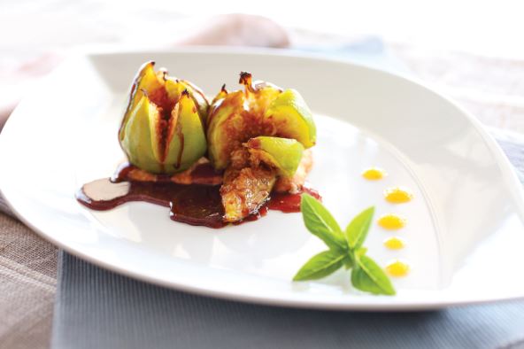 3. Smokve zarežite nožem do pola i pecite u pećnici pet minuta na 190 °C. Kad ih izvadite, prelijte ih kuhanim vinom. Ostavite da se ohlade i poslužite na keksu uz svježu metvicu ili bosiljak.