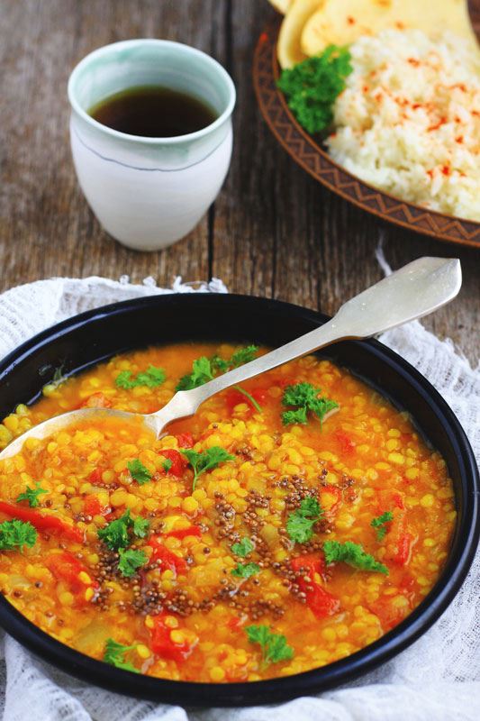 U posudi za kuhanje popržite tikvicu na malo maslinova ulja na srednje jakoj vatri te dodajte luk i češnjak. Izmiješajte, dodajte leću i sve začine osim sjemenki gorušice i soli. Kratko popržite i dodajte rajčicu. Izmiješajte i nakon dvije minute dodajte vodu. Ostavite da proključa. Kada zavrije, poklopite, smanjite temperaturu i pustite da se krčka oko 20 minuta, tj. dok se leće ne skuha. Kad se skuha, maknite poklopac i kuhajte još pet minuta. Po želji dodajte sol. Nakon toga maknite s vatre.
