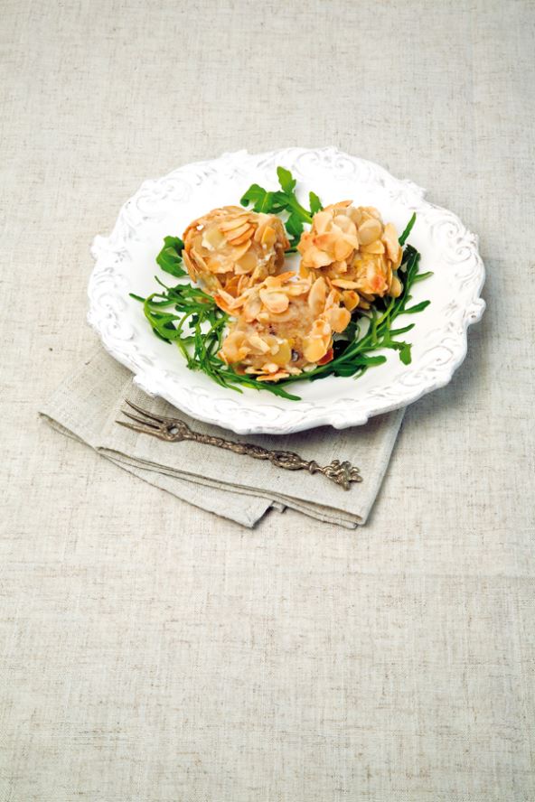 Kuhano proso izgnječite, pomiješajte s maslinama, dimljenim tofuom, muškatnim oraščićem i s krušnim mrvicama povežite u smjesu. Uronite u tempuru, a zatim u listiće badema. Pržite u dubokom ulju dok badem ne poprimi zlatnu boju.