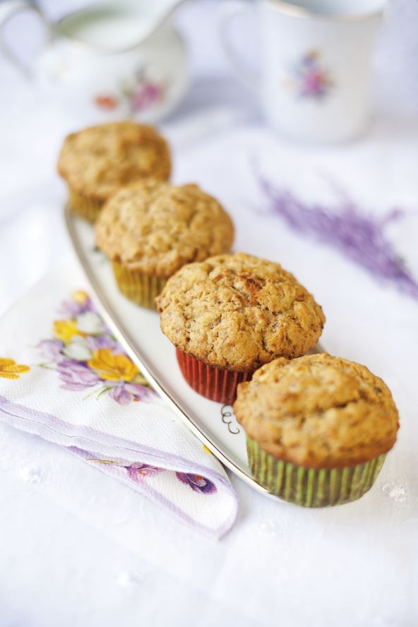 Povežite sve tekuće sastojke pa lagano umiješajte brašno, prašak za pecivo, cimet, brašno od zobenih pahuljica, maslac i orahe. Ulijte ih u do ¾ visine kalupa za muffine te pecite na 170 ˚C stupnjeva oko dvadeset minuta (čačkalicom provjerite jesu li pečeni). Dok su još vrući, po muffinim pospite malo mljevenog cimeta. Poslužite ih uz poslijepodnevni čaj, prepolovljene i tostirane za doručak ili na dječjoj zabavi umjesto kolača.