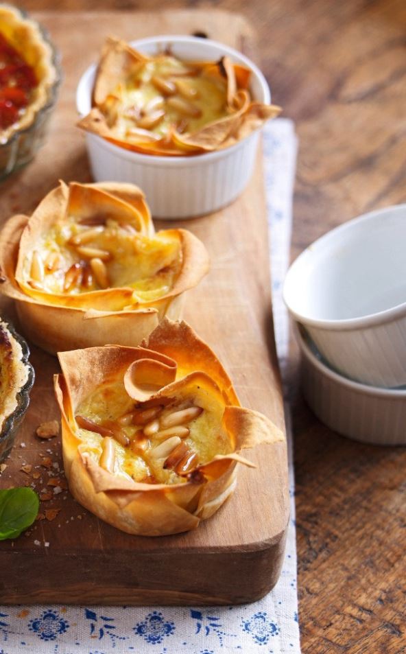 Narežite kore za pitu u manje kvadrate. Premazujući ih otopljenim maslacem, stavljajte ih jedan na drugi u kalupe za muffine, u četiri sloja. Posljednji sloj ne premazujte maslacem! Jabuke i orahe ubacite u košarice te ih prelijte s malo meda. U svaku košaricu dodajte i naribani sir, ukrasite ih pinjolima ili nasjeckanim orasima i pecite u pećnici desetak minuta dok kore ne dobiju zlatnu boju. Prilikom posluživanja možete dodati sol ili papar.
