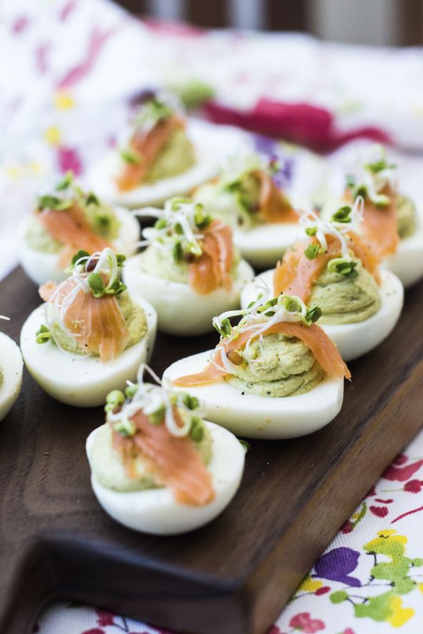 Jaja stavite u hladnu vodu, a kada voda provri, kuhajte ih 8 minuta. Ohladite ih, očistite od ljuske te pažljivo napola prerežite. Kuhane žumanjke miksajte s blanširanim vrhovima šparoga te svim preostalim sastojcima (osim lososa i klica) da dobijete kremu. Kuhana jaja napunite kremom, potom na svako jaje stavite trakicu dimljenog lososa te po vrhu pospite klice rotkvice. Ako želite, pospite i crnim mljevenim paprom te poslužite hladno.