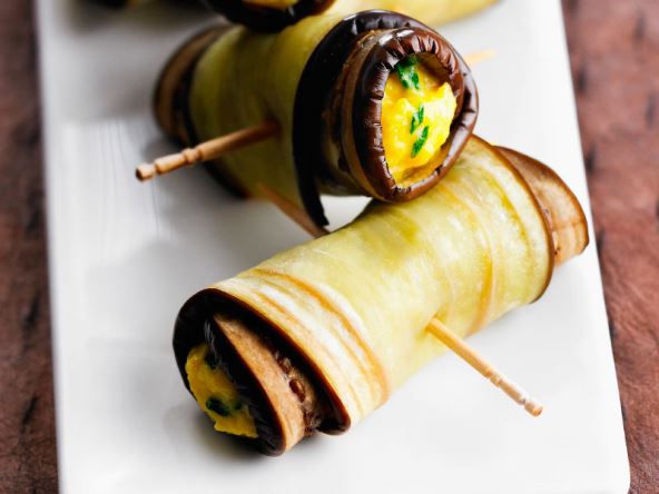 Na svaku plošku patlidžana stavite malo smjese te čvrsto smotajte u rolicu.