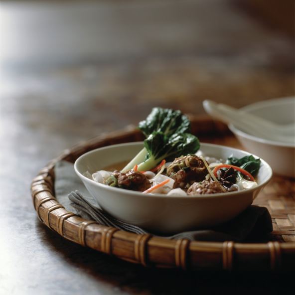 Zagrijte pećnicu na 180 ºC. Pomiješajte sve sastojke za mesne okruglice, oblikujte rukama otprilike 20 okruglica, posložite ih na dobro nauljen lim za pečenje te ih pecite oko 10 minuta. Za to vrijeme zakuhajte vodu i skuhajte rezance. U zasebnoj posudi zagrijte temeljac i dodajte mu začine. Kad proključa, dodajte sojin umak, kinesko rižino vino i šećer. Kuhajte na laganoj vatri. Kada se okruglice ispeku, uklonite višak masnoće od pečenja te ih dodajte u temeljac. Ubacite i kupus. Kuhajte minutu-dvije, dok kupus ne omekša. Procijedite rezance te ih isperite toplom vodom pod slavinom. Rasporedite rezance u četiri zdjelice. Na vrh stavite pet okruglica i prelijte juhom. Ukrasite nasjeckanim čilijem i đumbirom. Poslužite toplo.