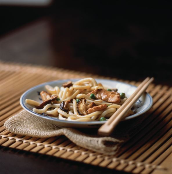 Začinite piletinu dvjema žlicama sojina umaka i rižinim vinom i ostavite sa strane. U velikom loncu zakuhajte vodu za tjesteninu.
