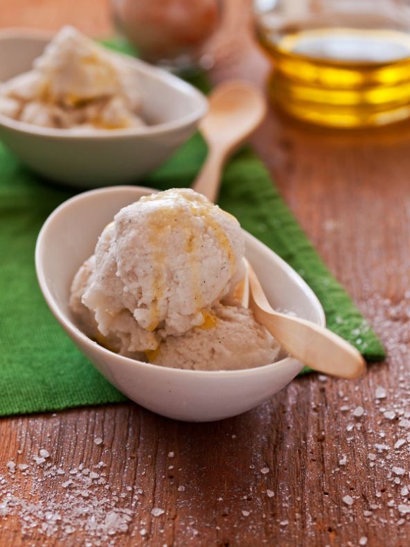 Pomiješajte kokosovo mlijeko, kokosovo vrhnje, agavin sirup i sjemenke jedne mahune vanilije. Sve zagrijte na laganoj vatri do točke vrenja. Maknite s vatre i ohladite do sobne temperature. Prebacite ohlađenu smjesu u aparat za sladoled i miješajte dok se smjesa u potpunosti ne stisne. Poslužite odmah uz preljev od nekoliko kapi maslinova ulja i nekoliko zrna himalajske soli. *