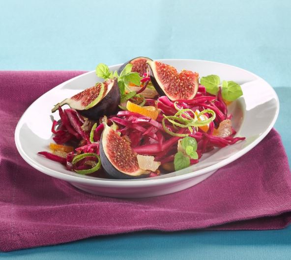 Crveni kupus narežite na tanke trakice. Luk oljuštite i nasitno nasjeckajte. Jabuku ogulite i narežite na ploške; smokve narežite na četvrtine. U većoj tavi zagrijte maslinovo ulje te na njemu propirjajte nasjeckani luk tako da postane staklast. Posolite i popaprite pa dodajte narezanu jabuku i smokve te prelijte balzamičnim octom. Kratko prokuhajte uz miješanje pa ulijte crno vino i vodu.