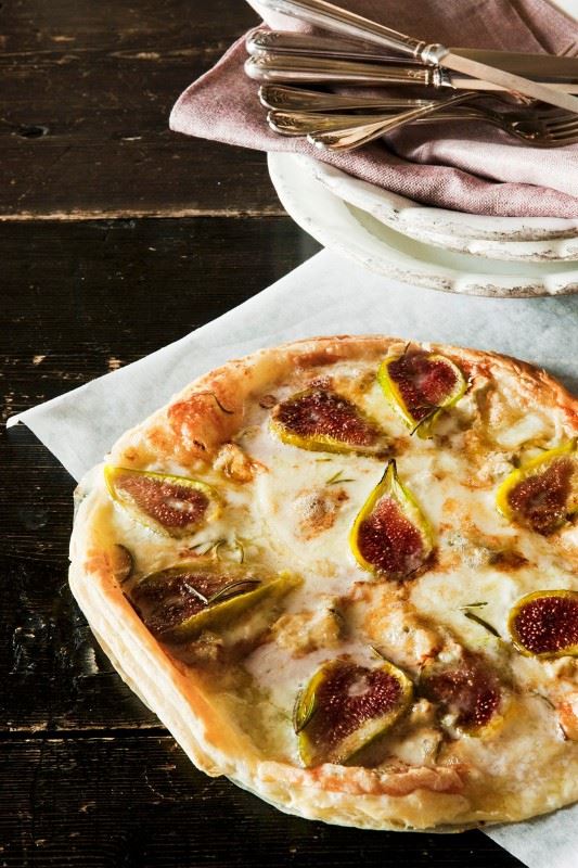 Za to vrijeme luk narežite na kolutove pa ih propirjajte na malo maslinova ulja kako bi omekšao. Na kraju pirjanja dodajte narezane smokve te ih pomiješajte s lukom. Pećnicu zagrijte na 180 stupnjeva. Tijesto za pizzu razvaljajte i premažite umakom od rajčica. Po njemu rasporedite propirjani luk sa smokvama te kozji sir narezan na ploškice. Pospite naribanim ementalerom te nakapajte medom. Pecite 25 do 30 minuta.