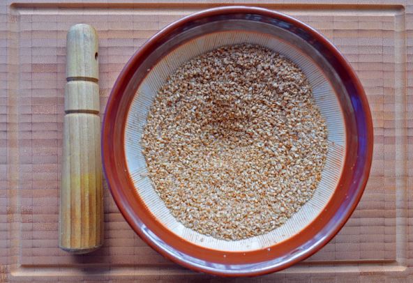 Prženi sezam prebacite u zdjelu, a u istoj tavi samo kratko popržite sol da bi ispario višak vlage ako je sol vlažna. Zatim u mužaru ili japanskoj zdjeli suribachi usitnite sezam zajedno sa solju, tako da jedan dio sjemenki sezama usitnite u prah. Osim ručno, prženi sezam i sol možete vrlo kratko izmiksati u blenderu. Kad se potpuno ohladi, ovaj začin čuvajte u zatvorenoj staklenci do dva tjedna i koristite ga umjereno, što nije lako jer je vrlo ukusan!