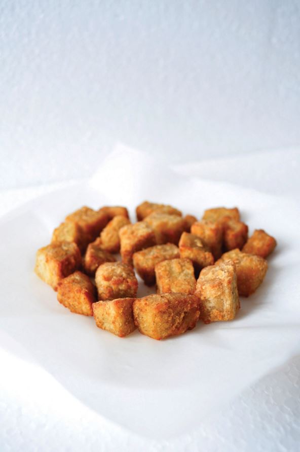 Pomiješajte sve sastojke za marinadu (osim brašna i ulja za prženje). Dodajte malo vode ako je pregusta. U dubljoj zdjeli kockice tofua, seitana ili tempeha prelijte marinadom, dobro promiješajte, prekrijte prozirnom folijom i pustite da odstoji na sobnoj temperaturi barem sat vremena (može i preko noći, u hladnjaku). Nakon mariniranja, svaku kockicu uvaljajte u malo brašna, protresite u dlanovima da otresete višak brašna te pržite u zagrijanom ulju dok kockice ne porumene (najbolje je pržiti u nekoliko tura i koristiti mali lončić u kojem će ulje dosezati visinu od barem tri prsta). Ocijedite na papirnatom ubrusu i poslužite kao predjelo, međuobrok, posuto po salati, kao croutone u juhama ili uz ovako pripremljene kockice napravite fini curry umak. Umjesto navedenih biljnih proteina, isto jelo možete napraviti i s kockicama piletine, uz dodatak žličice limuna u marinadu. Dobar tek!