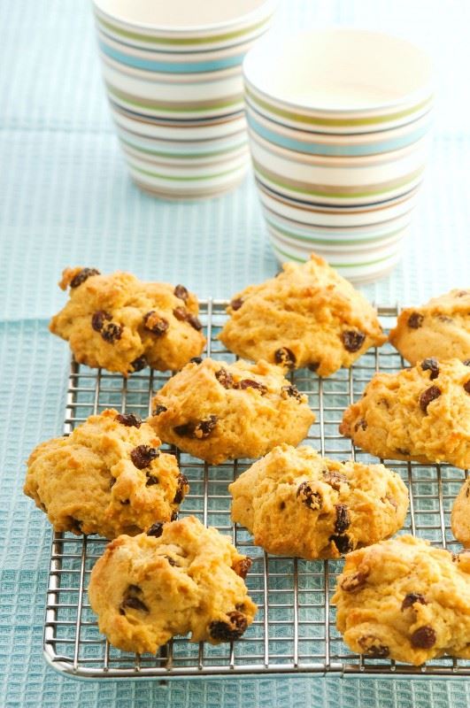 Pećnicu zagrijte na 180 stupnjeva, a lim obložite papirom za pečenje. Kuhanu buču zgnječite vilicom ili smiksajte u pire. U zdjelu stavite obje vrste brašna pa mu dodajte sol i začine, dobro promiješajte i umiješajte prašak za pecivo. Ručno ili mikserom dobro promiješajte smeđi šećer i kokosovo ulje. Dodajte pire od buče i nastavite miješati nekoliko minuta, da se sastojci dobro povežu. Postupno umiješajte brašno sa začinima. Na kraju, ako želite, umiješajte oprane i posušene grožđice ili čokoladu nasjeckanu na kockice. Na lim za pečenje žlicom stavljajte hrpice smjese. Pecite 12 minuta pa izvadite iz pećnice i ostavite minutu-dvije na limu za pečenje, a zatim prebacite na rešetku i ostavite da se ohlade.