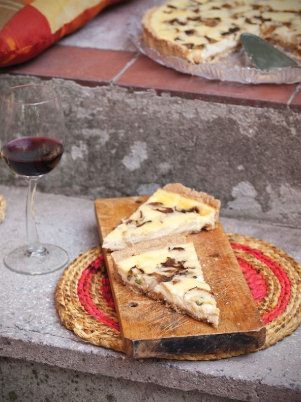 Ohlađeno tijesto razvaljajte između dva lista papira za pečenje na 1 cm debljine. Kalup za quiche lagano namastite i pospite brašnom te na njega pažljivo prebacite pripremljeno tijesto. Tijesto na nekoliko mjesta izbodite vilicom, prekrijte ga listom papira za pečenje te sve opteretite suhim grahoricama. Pecite 10 minuta u pećnici zagrijanoj na 180 °C.