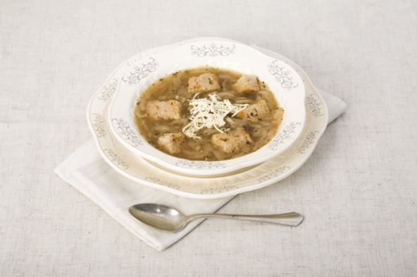 Na maslinovom ulju pirjajte luk narezan na tanke polumjesece, usitnjen češnjak i začine dok luk ne poprimi smeđu boju. Zalijte vinom i kuhajte nekoliko minuta, a zatim temeljcem i kuhajte još 40-ak minuta. Potkraj ubacite tamari, sol i papar. Kockice kruha pospite maslinovim uljem, posolite i u pećnici pecite 15-ak minuta na 200 stupnjeva, povremeno miješajući. Juhu poslužite s kockicama kruha i naribanim dimljenim tofuom.