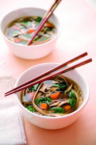 Kad voda proključa, ubacite oprane gljive i kuhajte 10 minuta. Izvadite gljive, odstranite stapku, a klobuke narežite i vratite u temeljac. Dodajte mrkvu i kelj i kuhajte 8 minuta. Ubacite tofu i tamari umak pa ostavite na laganom plamenu još 2 minute. Posebno skuhajte tjesteninu pa je prelijte juhom. Zimi ovu juhu možete obogatiti čajnom žlicom svježeg đumbirovog soka.