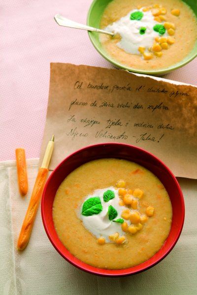 Pirjajte luk 2-3 minute, a zatim stavite leću i zobene pahuljice pa prelijte vrućim temeljcem (ostavite 1 dl za miso). Dodajte kombu algu koja će pomoći da se leća brzo i temeljito skuha i lakše probavi. Kuhajte 20 minuta, a zatim smiksajte kako biste dobili gustu krem juhu. Vratite je na kuhalo i dodajte razmućeni miso, papar i korijandar. Kad dodate miso, juha više ne treba ključati, već se na laganoj vatri grijati 2-3 minute. Ukrasite sojinim vrhnjem (ili običnim vrhnjem za kuhanje) i nasjeckanim širokolisnim peršinom.