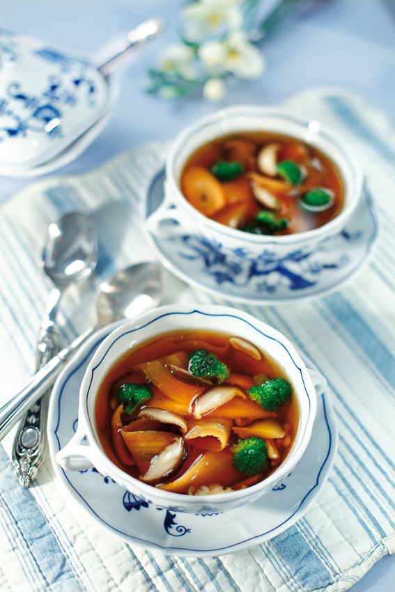 Operite i namočite shitake gljive u vodi najmanje 30 minuta. Zagrijte temeljac ili vodu u koju ste stavili povrtnu kocku za juhu. Kada temeljac zakuha, dodajte namočene gljive prethodno narezane na ploškice. Dodajte i vodu od namakanja. Gljive kuhajte u temeljcu desetak minuta, a zatim dodajte kuhano povrće i shoyu umak. Kuhajte još pet minuta. Pospite peršinom ili mladim lukom. Želite li hranjiviju juhu, dodajte kuhanu tjesteninu.