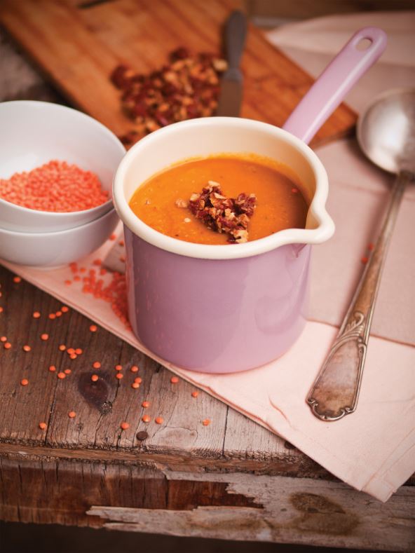 Na žlici maslinova ulja prepržite kumin i korijandar. Kada začini zamirišu i počnu pucketati, dodajte luk i đumbir te nastavite pržiti dok ne dobiju zlatnosmeđu boju. Dodajte mrkvu i kratko je pržite. Dodajte i opranu leću, dobro promiješajte pa ulijte oko 500 ml povrtnog temeljca. Smanjite vatru i kuhajte uz povremeno miješanje. Kada leća nabubri, ako je potrebno, dolijevajte još temeljca i kuhajte oko pola sata dok se leća potpuno ne raspadne.