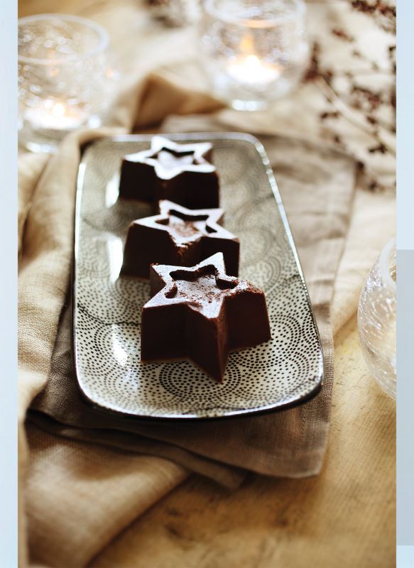 Rastopite na pari kakao maslac i kokosovo ulje, dodajte javorov sirup pa kakao i zatim ostale sastojke. Izlijte u kalupe u obliku zvjezdica i ohladite. Dodatke možete umiješati izravno u čokoladu i dobro promiješati prije nego što je izlijete u kalup ili ih staviti na vrh čokolade prije negoli se stvrdne.