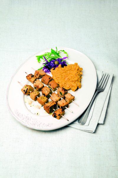 2. korak: Nabodite kvadratiće seitana na štapiće i ispecite na gril tavi, posolite i popaprite.