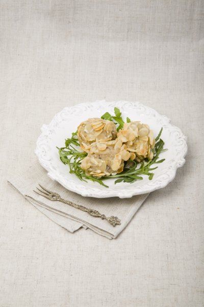 Kuhano proso izgnječite, pomiješajte s maslinama, dimljenim tofuom, muškatnim oraščićem i s krušnim mrvicama povežite u smjesu. Uronite u tempuru, a zatim u listiće badema. Pržite u dubokom ulju dok badem ne poprimi zlatnu boju.