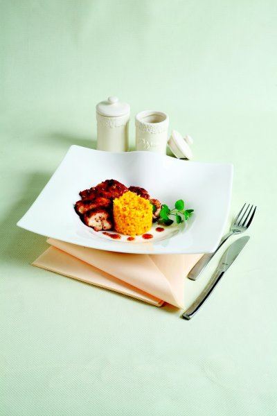 Piletinu posoliti, premazati smjesom senfa i meda i kratko popržiti na zagrijanoj tavi s obje strane pa premjestiti na lim i staviti u pećnicu na 200 stupnjeva 10 minuta. U međuvremenu na tavi popržiti sitno narezan luk, dodati rižu i šafran, kratko propirjati i podlijevati sa 2 dl povrtnog temeljca dok se riža ne skuha. Na kraju začiniti i povezati maslacem. Rižu staviti u kalup pa kad se malo stisne, poslužiti uz narezanu piletinu prelivenu ostatkom umaka od senfa i meda.