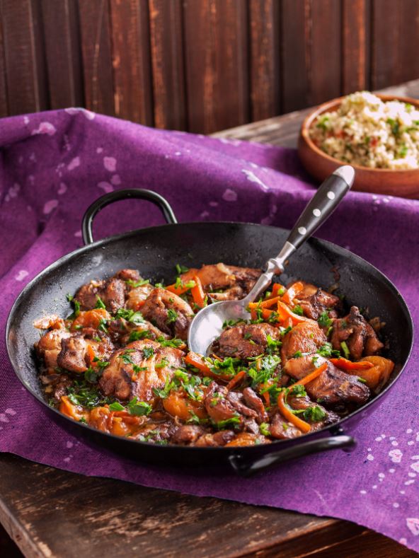U vrućoj vodi rastopite prstohvat šafrana pa time podlijte piletinu, dodajte suhe marelice i pustite da prokuha.