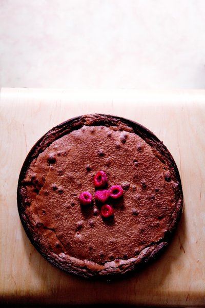 Izliti pola smjese u kalup, razmjestiti po njoj maline i pokriti ostatkom smjese. Peći 26-29 minuta. Kolač se malo podigne tijekom pečenja pa njegova gornja površina izgleda kao lagano istrgana. Kad štapićem prođete kroz sredinu kolača, ona mora biti vlažna. Ako na štapiću ostane malo smjese, to je upravo ono što želimo!
