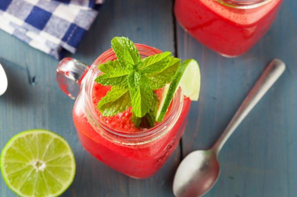 Komadiće lubenice stavite u blender i nakapajte limunovim sokom te smiksajte tako da dobijete potpuno gladak pire. (Kockice lubenice možete smiksati i štapnim mikserom.) Protisnite kroz gusto cjedilo i dobivenu tekućinu zasladite po ukusu te razrijedite s otprilike čašom vode. Ulijte u čaše u koje ste stavili led te ukrasite listićima metvice. Želite li da okus metvice bude intenzivniji, nekoliko listića smiksajte s lubenicom.