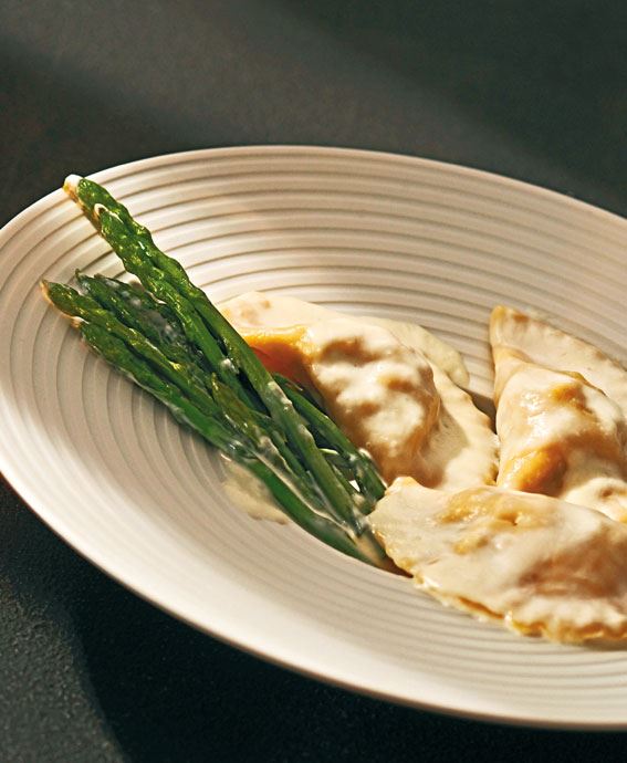 Od brašna, jednog jajeta, soli i vode umijesite glatko tijesto. Razvaljajte ga u tanku plohu i premažite razmućenim jajetom te izrežite na trake. Nadjev napravite miješanjem 2 jaja i tri vrste sira te prema potrebi malo griza. U svaku “krpicu” stavite žlicu nadjeva i poklopite pa utisnite rubove odgovarajućom čašom ili za ravijole posebnim kalupom, tako da dobijete oblik polumjeseca. Tako pripremljene raviole kuhajte kratko u slanoj kipućoj vodi. Umak ćete pripremiti tako da nakratko prokuhate očišćene šparoge u slanoj vodi, ocijedite ih i promiješate s bešamel umakom ili vrhnjem za kuhanje. Dodajte maslinovo ulje, sol i papar. Još tople raviole prelijte umakom i poslužite.