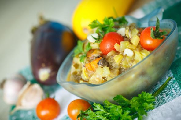 Ocijeđene kockice pečenog patlidžana stavite u zdjelu i pomiješajte s nasjeckanom metvicom, maslinovim uljem i prstohvatom soli. Rasporedite u 4 zdjelice pa na to stavite pečene karamelizirane rajčice zajedno s češnjakom s kojim su se pekle. Rajčice prelijte ostatkom maslinova ulja. Poslužite sa sezonskom salatom i hrskavim svježim kruhom.