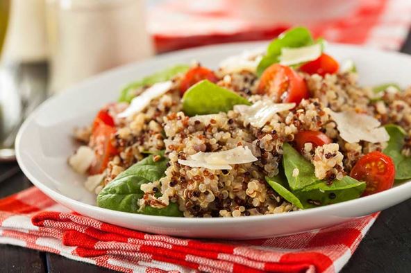 Kvinoju ispirite u situ sve dok voda ne bude potpuno bistra. Kuhajte je 10 minuta. Operite i očistite špinat, natrgajte ga na komade. Kratko ga obarite u posoljenoj uzavreloj vodi, a zatim ohladite u ledenoj vodi, ocijedite i istisnite višak vode. Slanutak operite i ocijedite. Rajčice narežite. Kvinoju ocijedite. Umiješajte slanutak, rajčicu i špinat. U posudu nalijte 3 cm vode, na nju stavite sito s kvinojom i povrćem, pokrijte krpom i poklopcem pa zakuhajte vodu. Kuhajte kvinoju i povrće na pari na srednjoj vatri oko 10 do 12 minuta. Limetu operite, posušite i naribajte 1 žličicu korice. Zatim je prepolovite i iscijedite sok. Maslac otopite u posudi. Dodajte chili u prahu, koricu limete i 2 žlice soka limete. Začinite. Kvinoju stavite u posudu i umiješajte maslac s limetom. Po želji poslužite ukrašeno parmezanom.