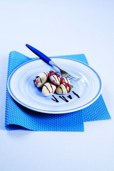 Jagode operemo i dobro osušimo. Bijelu čokoladu otopimo s malo maslaca i vrhnja za kuhanje da postane tekuća. Osušene jagode uronimo u čokoladu i zatim ih stavimo u hladnjak da se stegnu. Crnu čokoladu, isto kao bijelu, otopimo s malo maslaca i vrhnjem za kuhanje. Prošaramo po jagodama koje smo prethodno uronili u bijelu čokoladu. Poslužujemo na hladnom tanjuru.