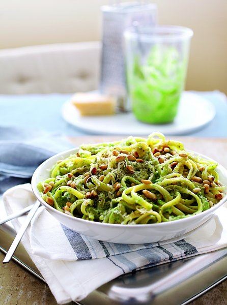 Skuhajte bavette prema uputama na pakiranju. Sačuvajte oko 1 dl vode u kojoj su se kuhale. Dok se tjestenina kuha, prerežite avokado napola, ogulite ga i uklonite košticu. Izmiksajte avokado, peršin, bosiljak, češnjak, peperoncino, sok od limuna, maslinovo ulje, malo vode u kojoj ste kuhali tijesto i pola ovčjeg sira. Umiješajte smjesu u bavette, pospite ostatkom naribanog sira, svježe mljevenim paprom i pinjolima. Poslužite odmah.