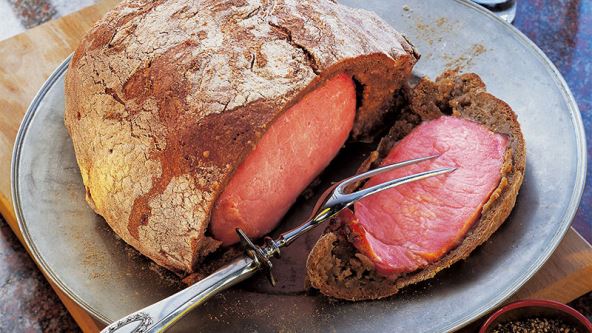 Istresite tijesto na pobrašnjenu radnu površinu. Razvaljajte ga na debljinu oko 2 cm i širinu koja odgovara duploj veličini šunke (kako biste tijesto mogli obložiti oko šunke). Omotajte tijesto oko šunke, položite u lim obložen papirom za pečenje pa ostavite da se diže još pola sata. Pećnicu unaprijed zagrijte na 210 °C.