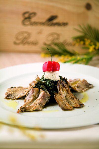 Krema od bakalara: 5 dag kuhanog bakalara, prstohvat soli, papra, češnjaka, svježeg peršina, žlica maslinovog ulja – sve izmiješati štapnim mikserom. Srdele posložiti na špinat, dodati kremu od bakalara i ukrasiti svježom čili papričicom.
