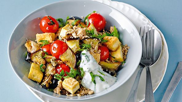 Kus-kus promiješajte i nakapajte maslinovim uljem. Pomiješajte ga s pripremljenim sastojcima i ukrasite sjeckanim bosiljkom. Po želji, poslužite s jogurtom.